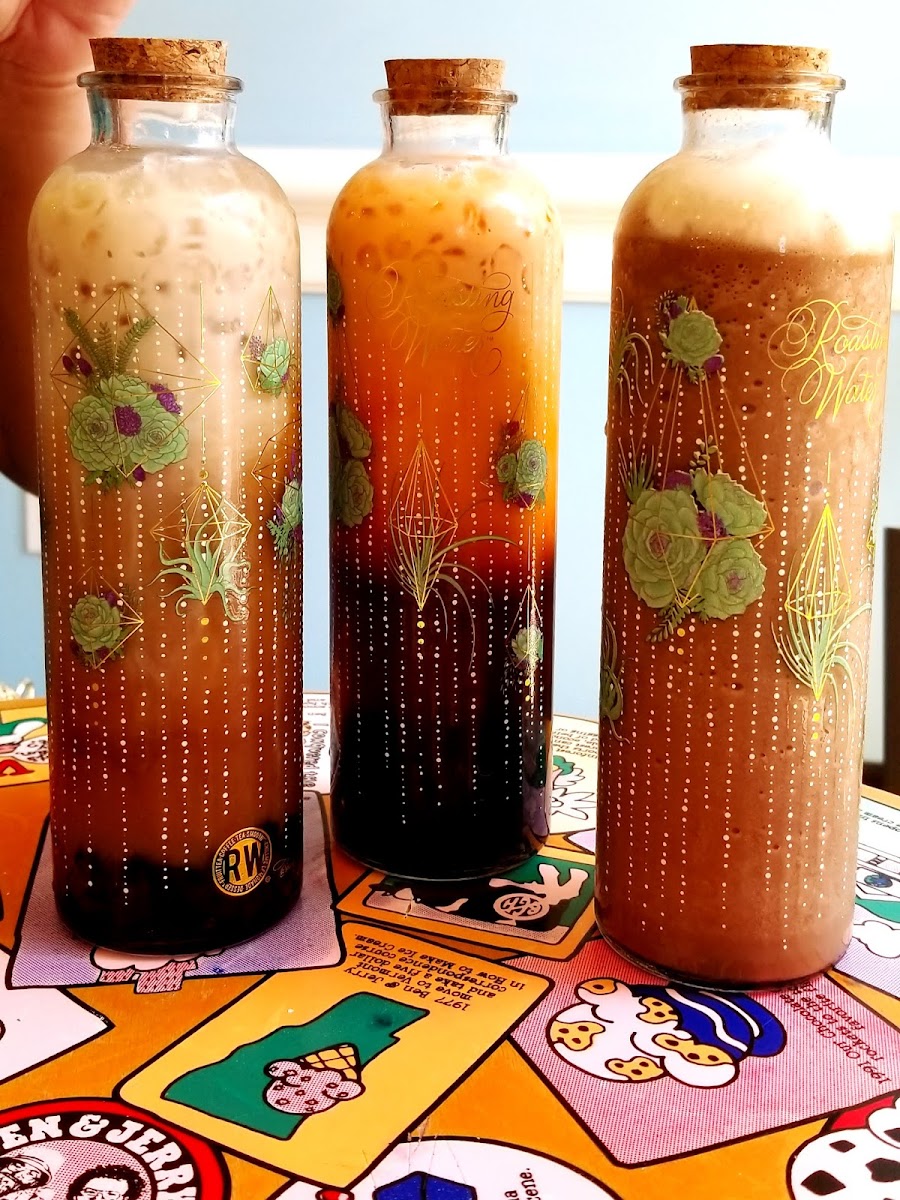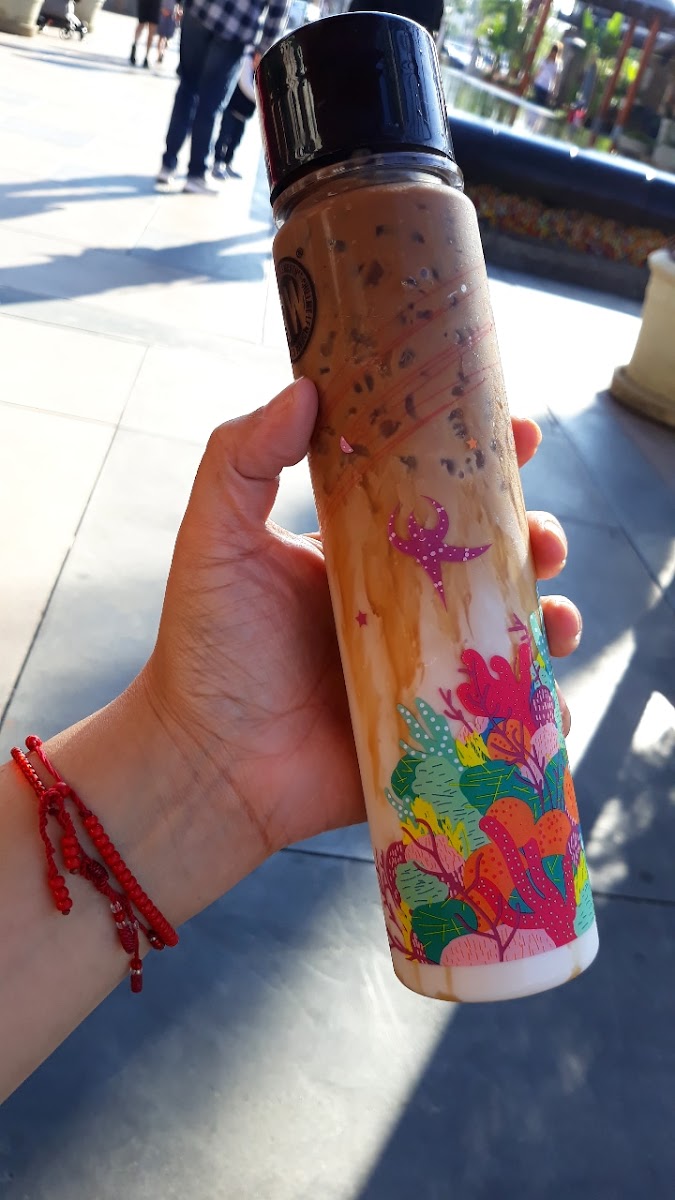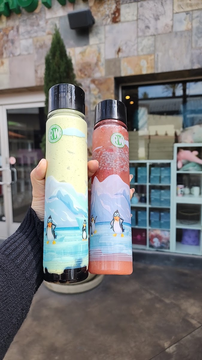 What sets Roasting Water apart isn’t just the drinks themselves, but the experience around them. Each beverage comes in a collectible, reusable bottle — often featuring playful designs that make the visit feel a bit like a small event or a chance to start a unique collection. These bottles have sturdy caps, which locals often appreciate for taking their drinks on the go or reusing them later, a detail that feels both practical and thoughtful in a neighborhood where people are on the move.